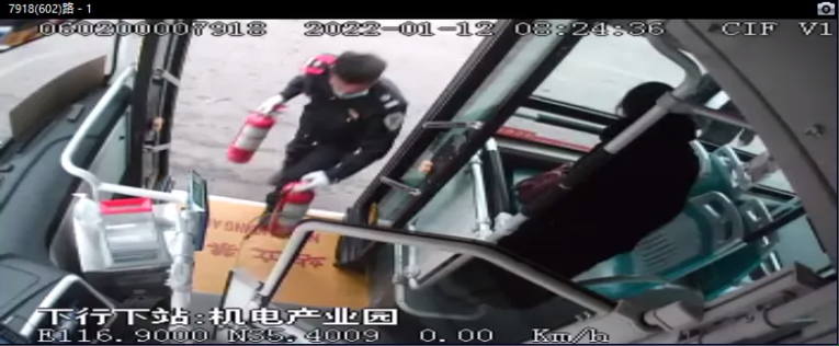 大概过了两三分钟后,火势好像并没有变小,车辆内的一名乘客连忙提起车厢内的另一个灭火器上前帮助,又过了两分钟后,在驾驶员和热心乘客的救助下火被成功扑灭了。