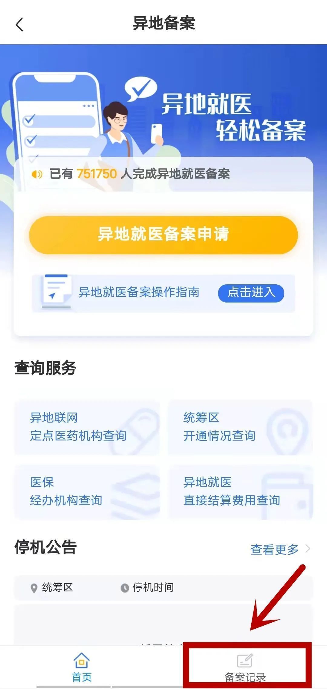 申请跨省异地就医备案后,可在“异地备案”页面下方找到备案记录,点击即可查询备案结果及详情。