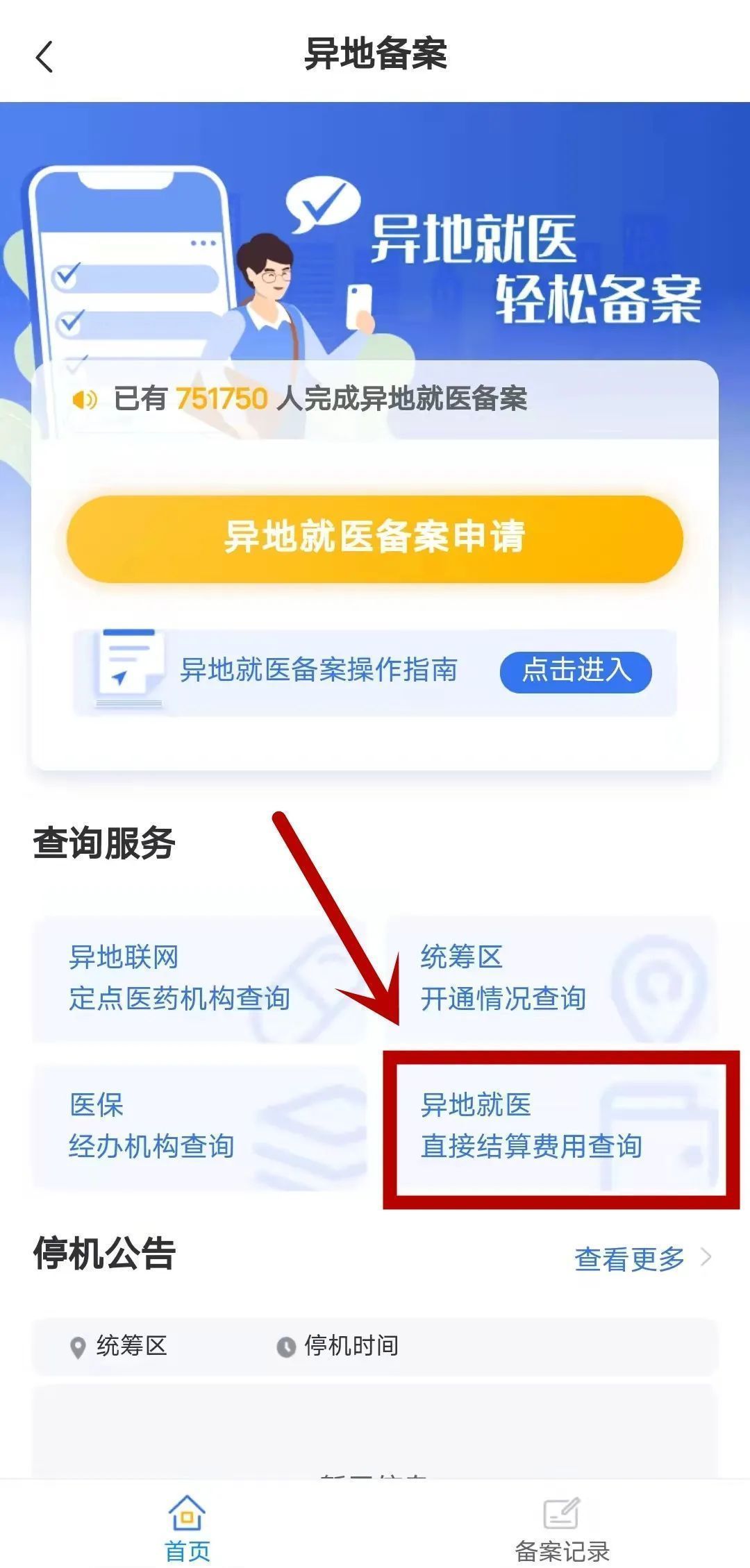 “国家医保服务平台”医保APP“异地备案”页面下方,找到并点击“异地就医直接结算费用查询”可查询异地就医费用明细。