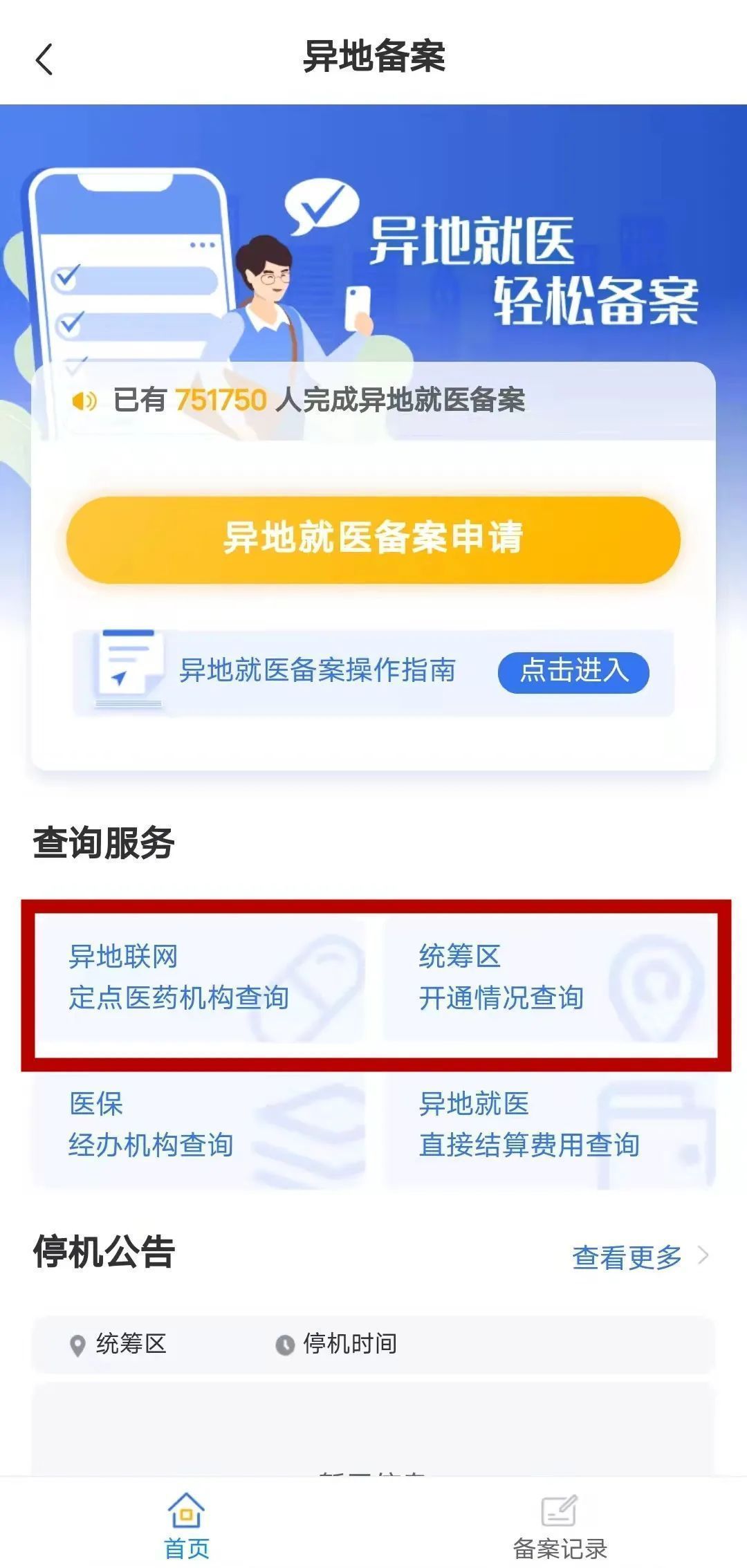 参保人在“异地备案”页面,可查询统筹地及定点医药机构的开通情况。