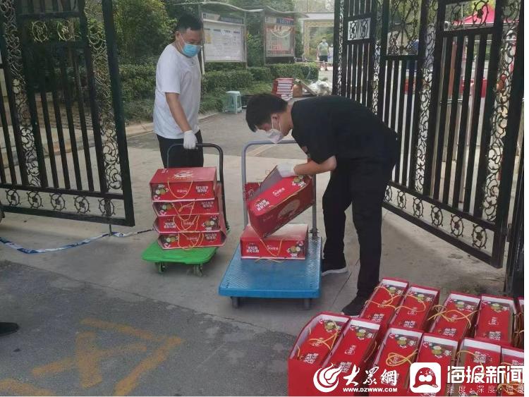 张文强和阎凌宇在小区门口帮助居民搬运生活物资