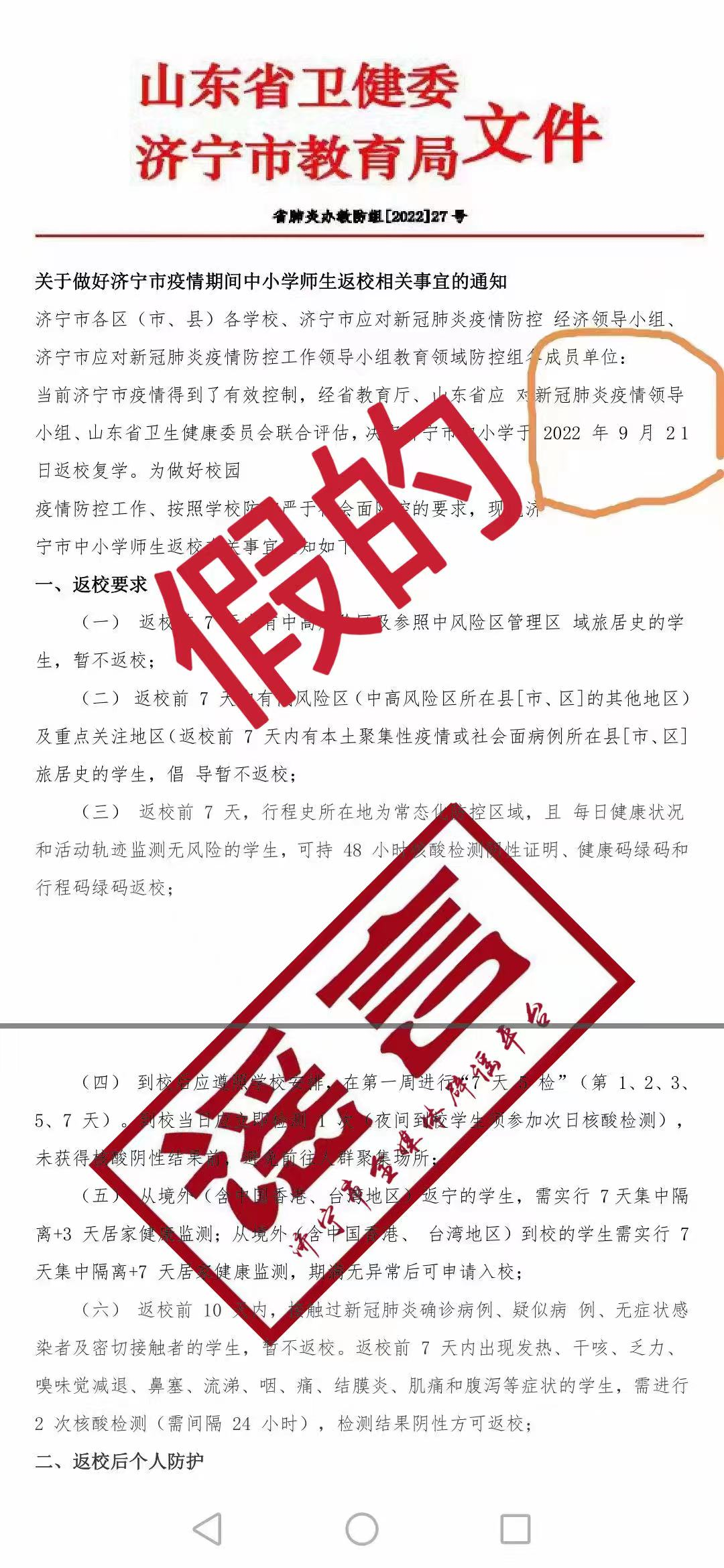 辟谣!这则返校通知是假的! 来源:济宁市全媒体辟谣平台 编辑:李一立 09-16 9月15日晚,一则《关于做好济宁市疫情期间中小学师生返校相关事宜的通知》(省肺炎办教防组〔2022〕27号)在济宁家长之间流传,引发关注。经平台向济宁市教育局核查证实,网传信息为谣言。济宁市教育局并未发布该文件,也不存在“省肺炎办教防组”这一机构。平台在此提醒广大学生、家长及时关注官方权威发布信息,不造谣、不信谣、不传谣,不以讹传讹,共同营造文明安全的网络空间。济宁市全媒体辟谣平台2022年9月16日
