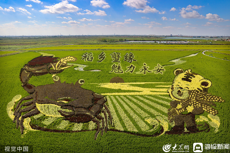 2022年9月16日,山东东营,垦利区永安镇稻田画景观创意基地,水稻为笔勾勒出的两幅大型3D彩色稻田画。