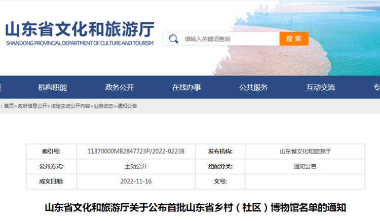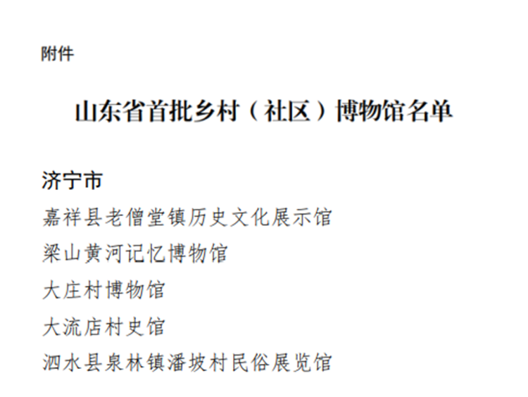 济宁新闻网讯 近日,为贯彻落实《山东省文物事业发展“十四五”规划》、山东省委宣传部、省文化和旅游厅等八部门《关于山东省博物馆改革发展的实施意见》的有关要求,依据《关于开展2022年全省乡村(社区)博物馆备案认定工作的通知》,省文化和旅游厅开展了全省首批乡村(社区)博物馆备案认定工作。在各地审核初评的基础上,综合会议评审、现场检查等工作环节,现将备案认定的全省首批乡村(社区)博物馆名单予以公布。其中,济宁市嘉祥县老僧堂镇历史文化展示馆等五个博物馆入选。