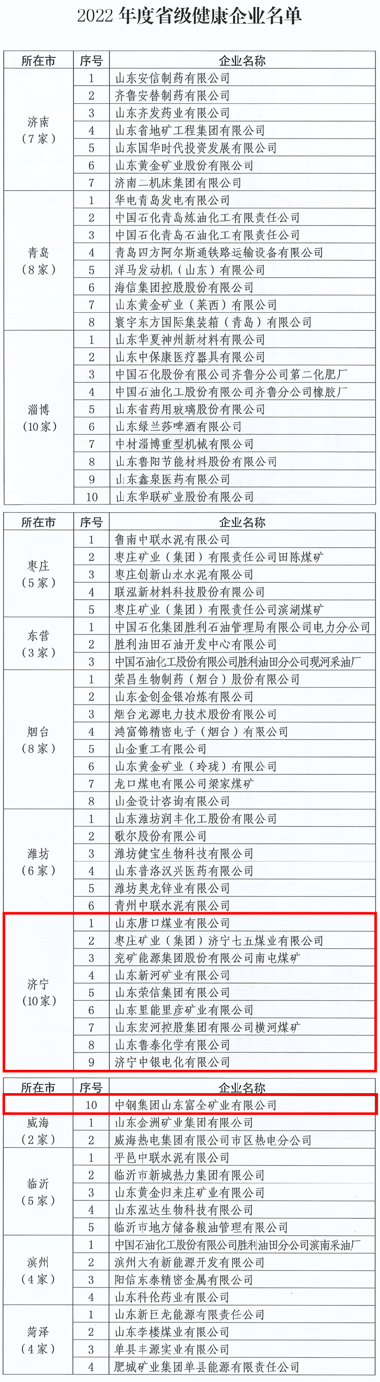 济宁10家企业上榜2022年度省级健康企业名单 来源:大众网·海报新闻 编辑:李一立 12-21 山东省卫生健康委员会大众网·海报新闻记者 王爽爱 济宁报道日前,山东省爱国卫生运动委员会办公室通报2022年度省级健康企业名单。其中,济宁10家企业榜上有名。详细名单如下: