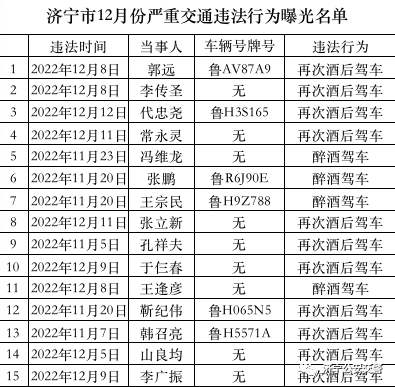 济宁市曝光12月份严重交通违法行为名单 来源:大众网·海报新闻 编辑:李一立 12-23 大众网·海报新闻记者 王爽爱 济宁报道12月22日,济宁公安交警发布《济宁市12月份严重交通违法行为曝光名单》。详细名单如下: