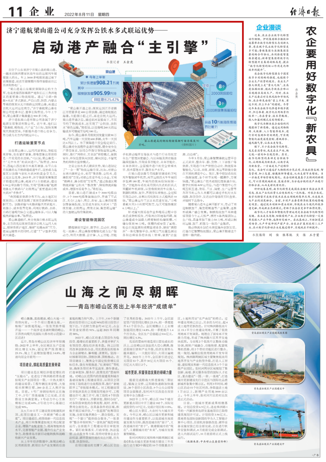 2022年8月11日,《经济日报》刊发文章《济宁港航梁山港公司充分发挥公铁水多式联运优势——启动港产融合“主引擎”》详解了济宁港航梁山港以“强港航、畅物流、兴产业”为目标,加快发展现代物流贸易,不断提升港口核心竞争力,努力成为北方内河航运中心的宏伟蓝图。梁山港是山东煤炭保障供应的主力军,也是连接西部煤源产地和长江三角洲地区的重要港口物流枢纽。通过‘公路+铁路+水运’多式联运,产自山西、陕西、内蒙古等地的煤炭从瓦日铁路运到梁山港,再通过京杭大运河运往南方......