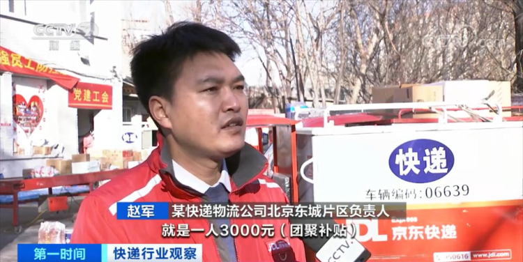 某快递物流公司北京东城片区负责人 赵军:快递员有孩子的如果接到北京,就是一人3000元团聚补贴。