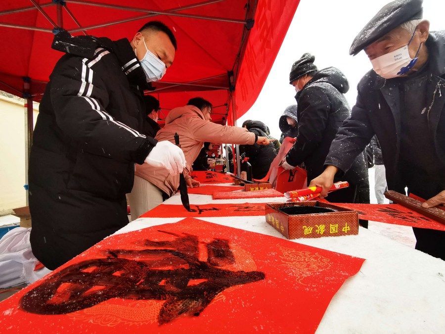 1月14日,在山东省滨州市滨城区北镇大集,书法爱好者在“黄河大集”春节季活动中为人们书写春联。新华社发(李荣新摄)