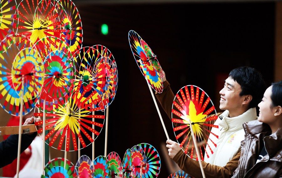 1月14日,人们在山东省临沂市“非物质文化遗产月”活动现场观赏民间艺人制作的风车。新华社发(张春雷摄)