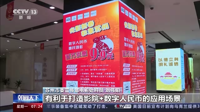 苏州市委宣传部电影处科员 刘伟阳:发放优惠通兑码5万份,累计投入补贴金额超过了100万元,有利于打造“影院+数字人民币”的应用场景。