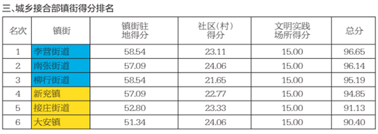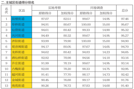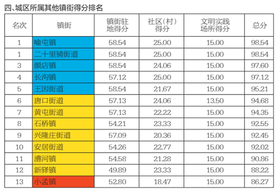 据了解,测评成绩在95分及以上的挂蓝牌,95分以下的挂黄牌,各类排名(主城区街道、城乡接合部镇街、城区所属其他镇街、市直部门单位)最后一名且测评成绩在90分以下的挂红牌。各区排名的依据为主城区街道平均成绩占70%的权重,城乡接合部镇街和其他镇街平均成绩占30%的权重,两者相加为各区总分。对本次测评挂黄牌的19个镇街、13个市直单位(高校)进行通报批评,对挂红牌的小孟镇由市创城办挂牌重点督办。