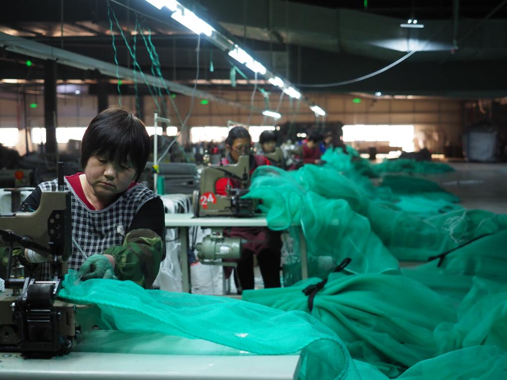 工人在车间内加工绳网产品。新华社记者高天 摄