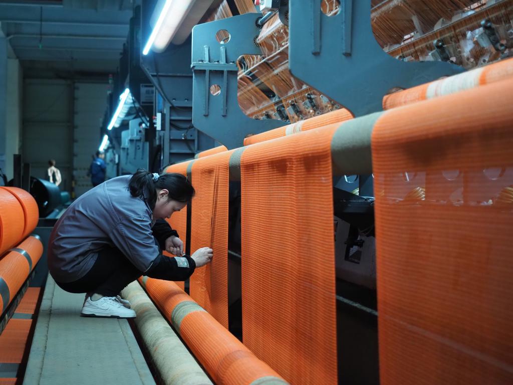 工人在数控经编机旁仔细检查绳网编织情况。新华社记者高天 摄