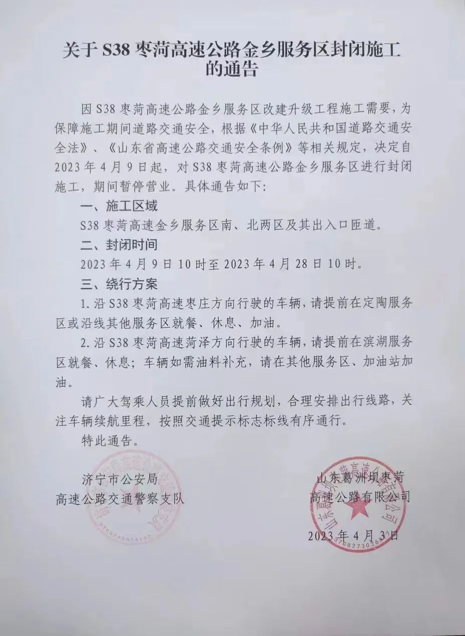 因S38枣菏高速公路金乡服务区改建升级工程施工需要,为保障施工期间道路交通安全,根据《中华人民共和国道路交通安全法》、《山东省高速公路交通安全条例》等相关规定,决定自2023年4月9日起,对S38枣菏高速公路金乡服务区进行封闭施工,期间暂停营业。具体通告如下: