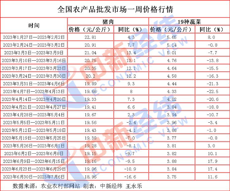 农业农村部数据显示,6月,猪肉批发价格仍处于回落通道,蔬菜价格继续回升。截至6月29日当周,猪肉及19种蔬菜批发市场周均价为19.06元/公斤、3.84元/公斤,分别较截至6月1日当周均价下跌1.14%和上涨0.79%,同比分别下跌10.9%和上涨17.4%。