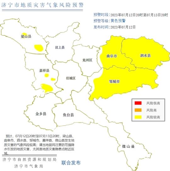 预计,07月12日20时至07月13日20时,梁山县、曲阜市、泗水县、邹城市、嘉祥县、微山县发生地质灾害的气象风险较高;请当地居民注意防范强降水引发的地质灾害,尤其是地质灾害隐患点附近区域。(市自然资源和规划局、市气象局联合发布2023年07月12日)