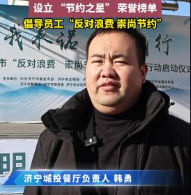 【反对浪费 崇尚节约丨“反食品浪费”内容纳入食堂考核】 作者: 编辑:刘黛眉 01-17 1月15日上午,“我承诺 我践行”济宁市“反对浪费 崇尚节约”文明餐桌行动启动仪式在文化广场举行。省运会指挥中心、香港大厦食堂经理表示,“反食品浪费”内容纳入食堂考核,让绿色低碳的发展理念、勤俭节约的生活方式更加深入人心。