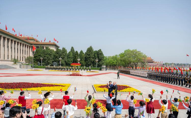 4月23日上午,国家主席习近平在北京人民大会堂同来华进行国事访问的阿塞拜疆总统阿利耶夫举行会谈。这是会谈前,习近平在人民大会堂东门外广场为阿利耶夫举行欢迎仪式。