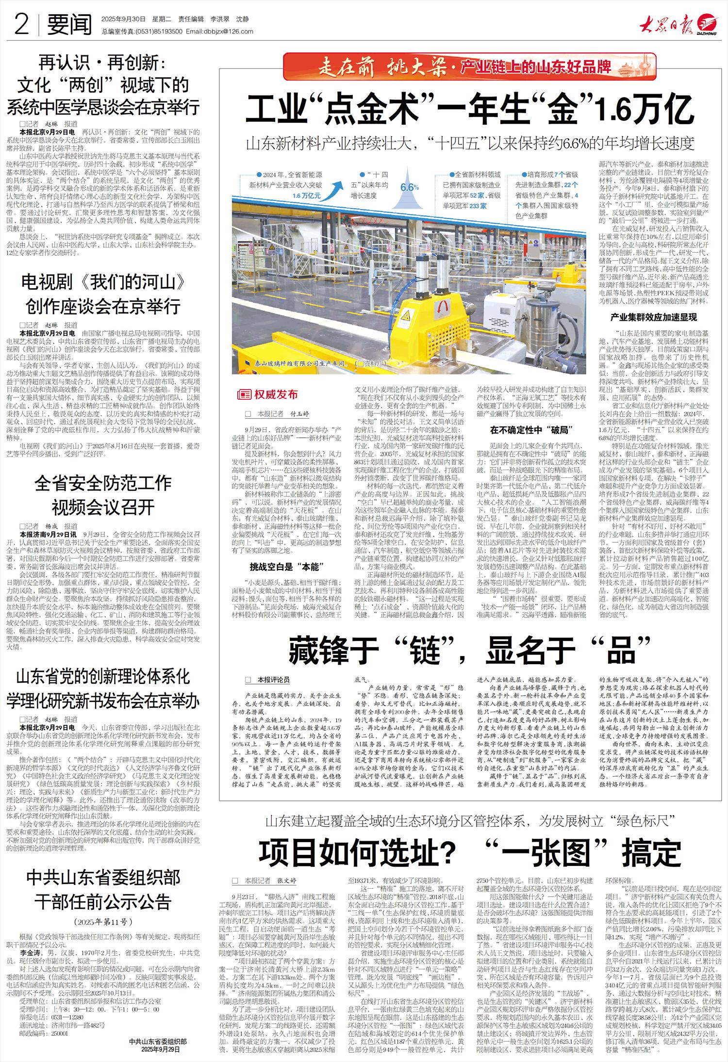 9月29日,省政府新闻办举办“产业链上的山东好品牌”——新材料产业链记者见面会。