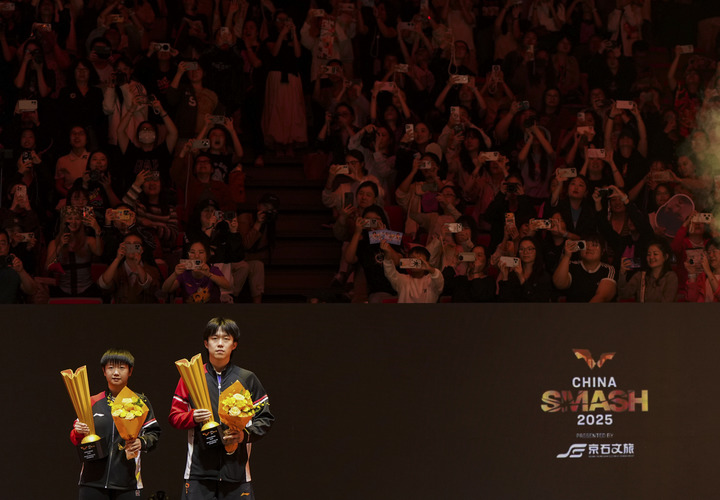 10月3日,在北京举行的2025年世界乒乓球职业大联盟(WTT)中国大满贯赛混合双打决赛后,冠军中国组合王楚钦(右)/孙颖莎在颁奖仪式上。新华社记者 鞠焕宗 摄
