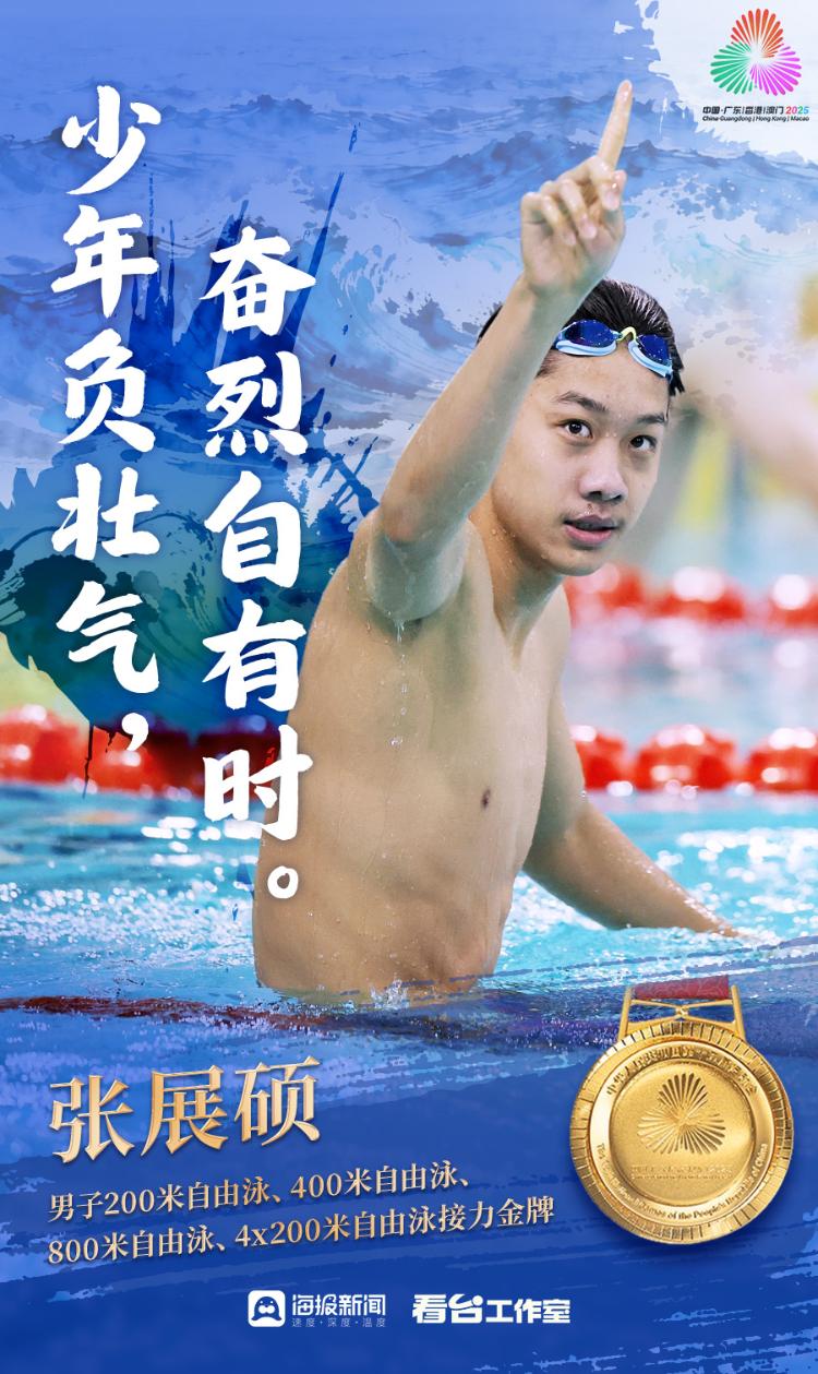 18岁的张展硕成为十五运会首个四金王,并三次破纪录,当少年负壮气而来,那劈波斩浪的青春,终将化作泳池里最璀璨的星光。