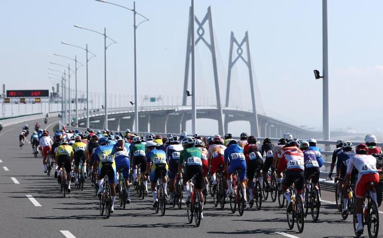 11月8日,参赛选手在港珠澳大桥骑行。当日进行的第十五届全国运动会公路自行车男子个人赛,赛道全程231.8公里,选手经过港珠澳大桥,跨越粤港澳三地。图源:新华社