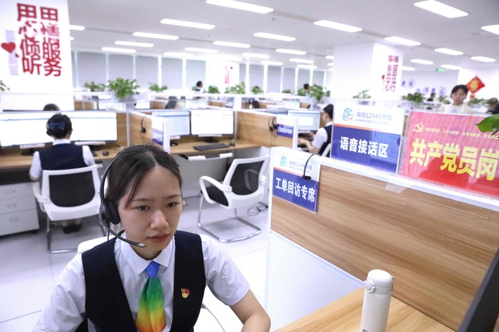 2025年9月23日,接线员在海南12345热线中心话务厅接听群众来电。新华社记者 郑悦 摄