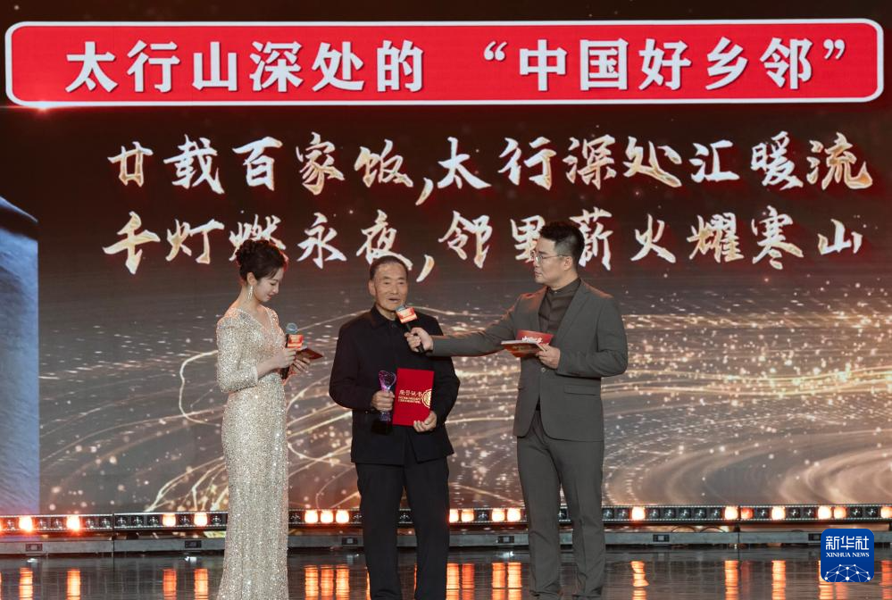 1月28日,由新华社主办的“中国网事·感动2025”公益盛典暨年度颁奖典礼在北京举行,活动揭晓“中国网事·感动2025”十大年度网络人物。这是“太行山深处的‘中国好乡邻’”黄崖沟村村民代表(中)出席颁奖典礼。新华社记者 李安 摄