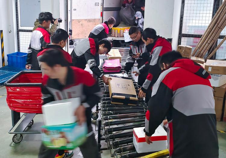 2023年11月11日,浙江省宁波市宁海县的快递员在分拣快递。