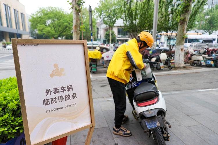2025年4月22日,在江苏省南京市,商家为外卖员提供车辆临时停放点。2025年,灵活就业和新就业形态劳动者权益保障水平稳步提高:快递、外卖、货运等行业签订集体合同3576份,覆盖平台企业及其合作企业1.32万家;截至2025年11月底职业伤害保障试点累计超2420万人参保。