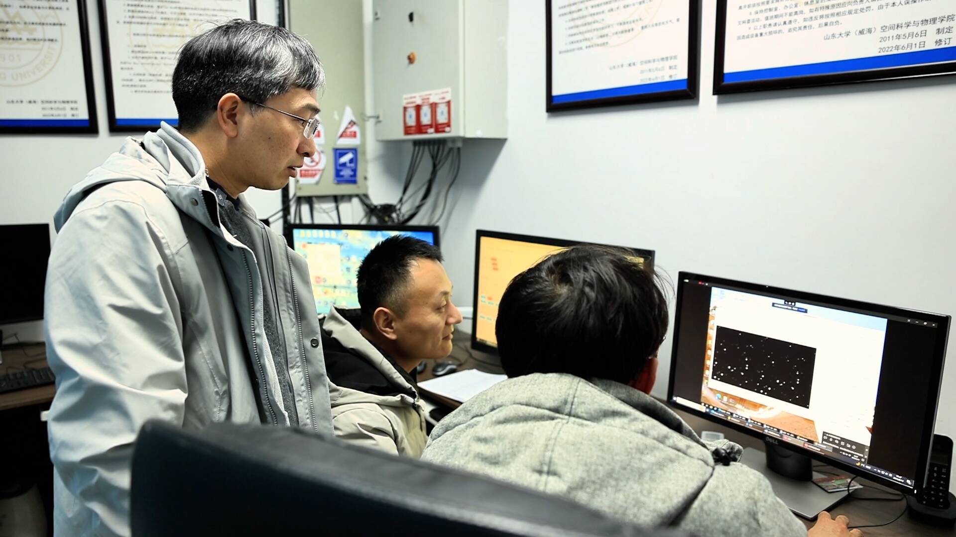 晚上九点,山东大学威海分校天文台内依旧灯火通明。山东大学空间科学研究院胡绍明院长正远程查看新疆慕士塔格观测站的设备运行情况。