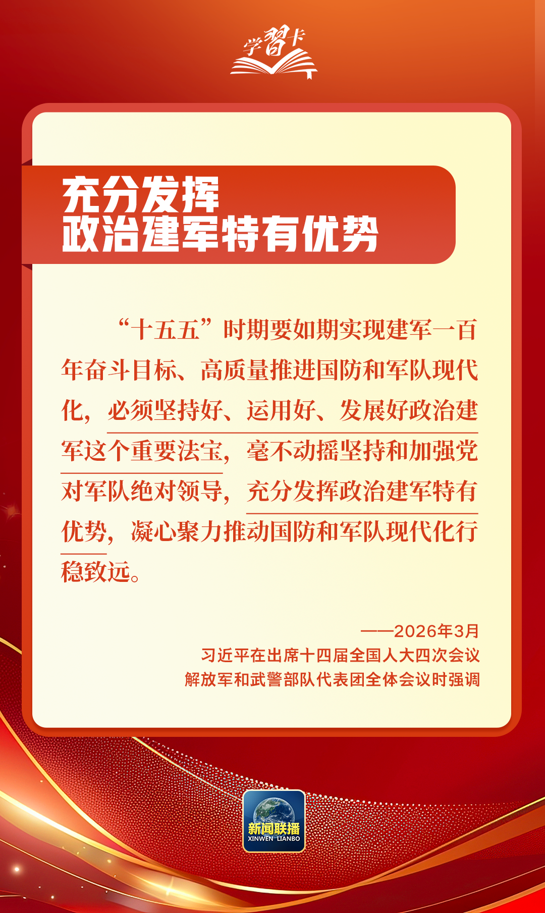 学习卡丨总书记两会“下团组”,聚焦这些重点工作 来源: 编辑:终审 03-10 2026年全国两会正在召开,代表委员们共商“十五五”发展大计,共谋中国式现代化建设新篇。3月5日至7日,习近平总书记先后参加江苏代表团审议、看望全国政协委员、出席解放军和武警部队代表团全体会议,围绕经济大省发展、健康中国建设、政治建军等重大议题作出深刻阐释、提出明确要求,为“十五五”开好局、起好步提供科学指引。总监制丨闫帅南监制丨王元主编丨王兴栋编辑 制图丨马玮璐
