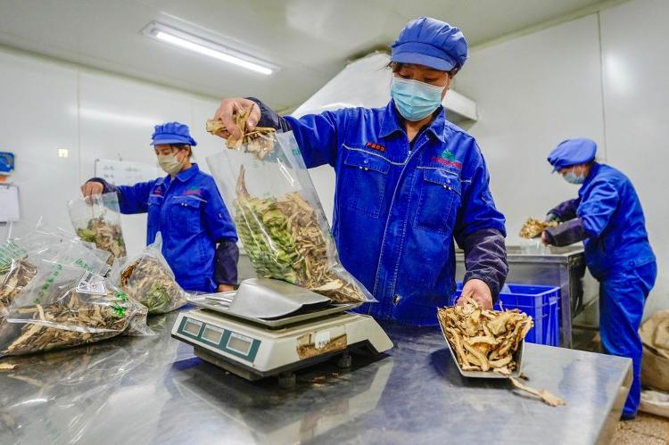 2026年1月26日,工作人员在宁夏固原市隆德县一家药材加工企业分包当归。新华社记者 杨植森 摄