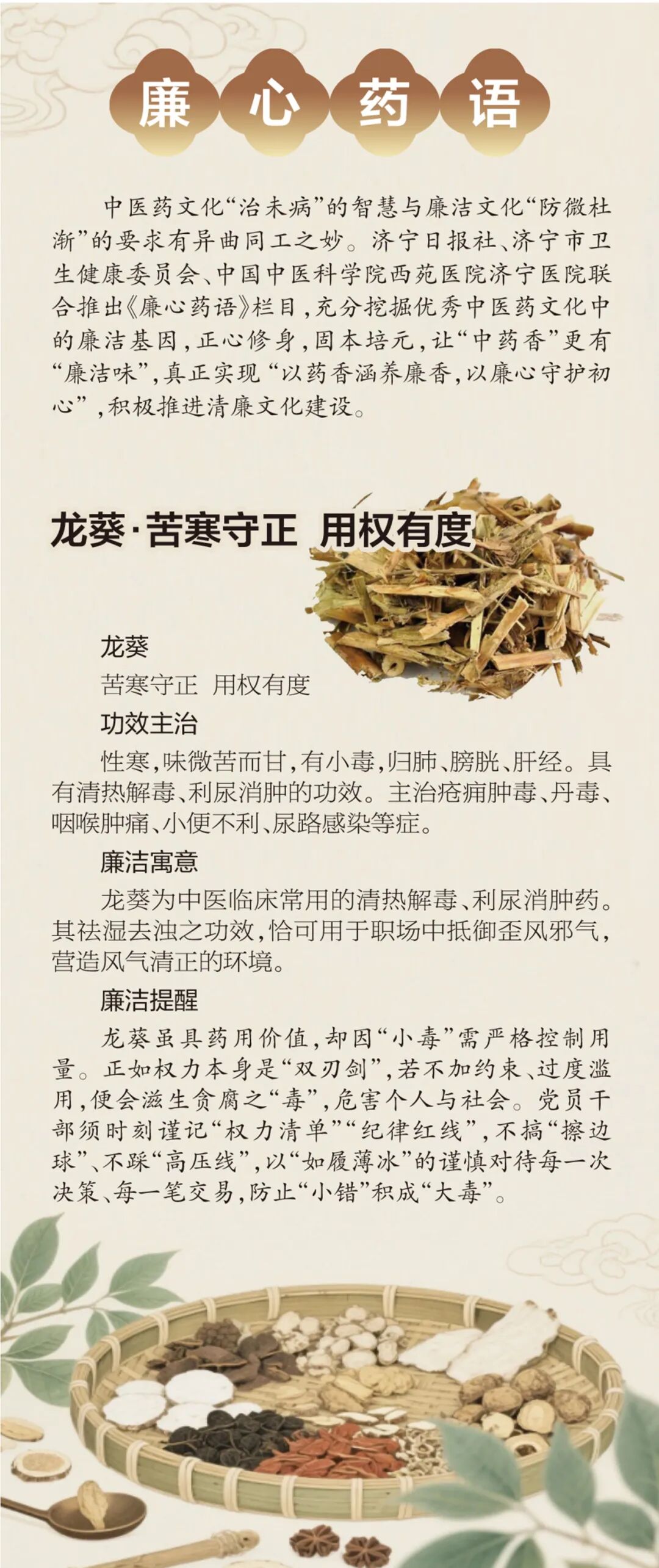 廉心药语丨龙葵·苦寒守正 用权有度 来源: 编辑:刘黛眉 03-19 中医药文化“治未病”的智慧与廉洁文化“防微杜渐”的要求有异曲同工之妙。济宁日报社、济宁市卫生健康委员会、中国中医科学院西苑医院济宁医院联合推出《廉心药语》栏目,充分挖掘优秀中医药文化中的廉洁基因,正心修身,固本培元,让“中药香”更有“廉洁味”,真正实现 “以药香涵养廉香,以廉心守护初心” ,积极推进清廉文化建设。