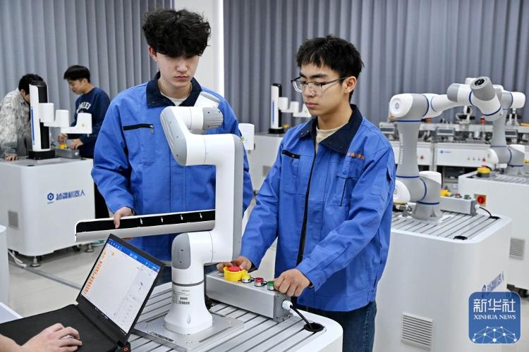 ↑ 3月26日,青岛职业技术学院学生在课堂上练习机器人操作。