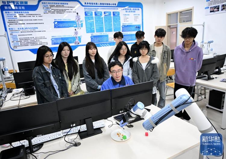 ↑ 3月26日,青岛职业技术学院老师葛沛鑫(前)在给学生上具身智能数据工程课。