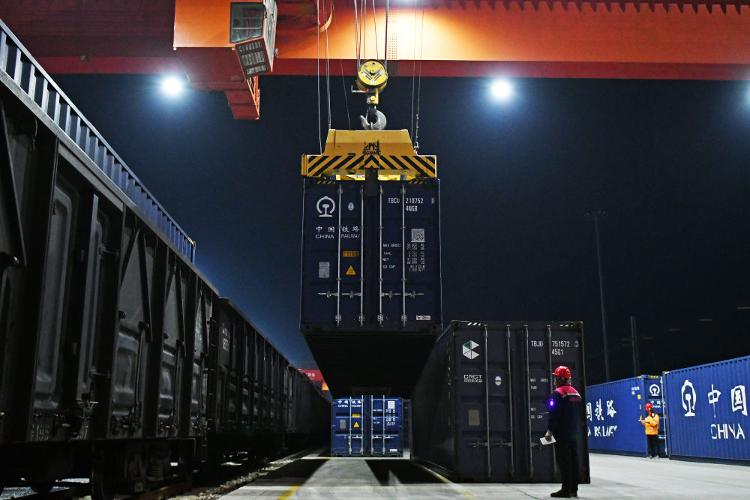 4月11日,烟台至广州铁路集装箱班列开行满一周年,发送化工、食品、机械设备等货物超21万吨。货物抵达广州后将分拨至港澳,为“山东制造”更好地融入粤港澳大湾区注入了强劲动能。新华社发(孙文潭 摄)