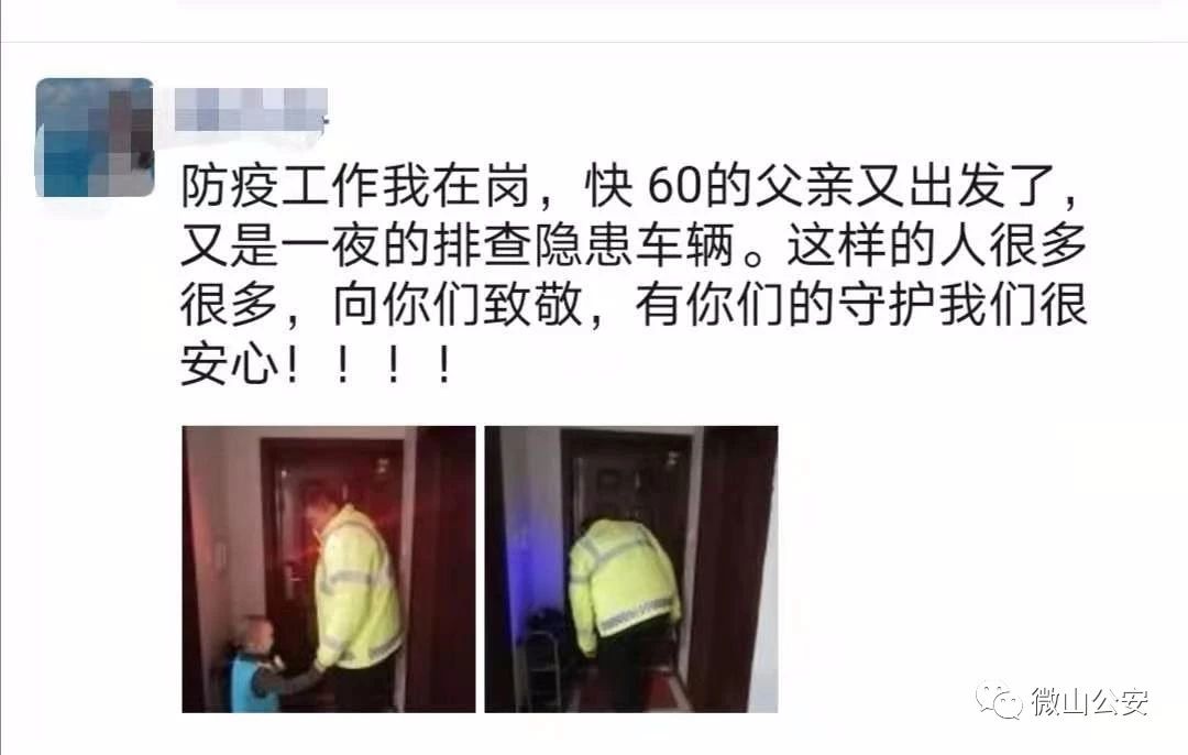 “ 防疫工作我在岗快60岁的父亲又出发了又是一夜的排查隐患车辆这样的人很多很多向你们致敬有你们的坚守我们很安心!!”