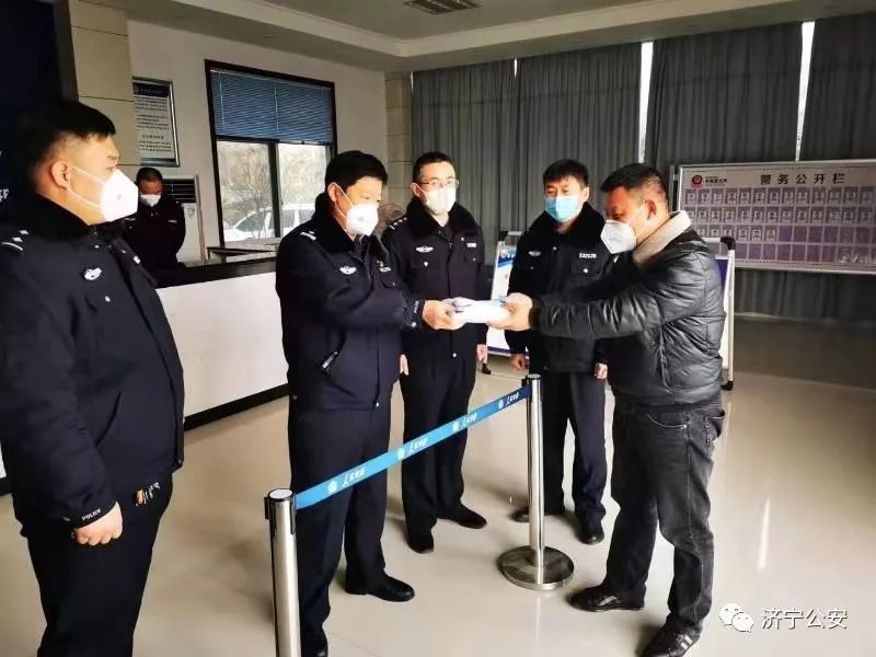 抗疫一线金乡街道群众刘某亲手将100个防疫口罩送到金乡县公安局南城派出所民警手中以实际行动表达对坚守防疫一线民警的感谢和敬意。